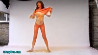 Julia est habillée avec un chemisier léger et des collants. Elle est couverte de peinture orange avec un pistolet à peinture. Les seins, la tête, le sexe ... c'est extra de la voir brillante de peinture. Durée 12:44
