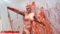 Sara est toujours attachée et aspergée de peinture. Ca lui coule partout et dans la bouche aussi ... du rouge, du blanc, du bleu ... Elle termine la série au sol et il y a de la peinture partout ... Durée 19:00